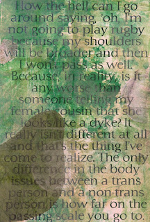 No. 5: "How the hell can I go around saying, 'oh, I'm not going to play rugby because my shoulders will be broader and then I won't pass as well.' Because, in reality, is it any worse than someone telling my female cousin that she looks like a dyke? It really isn't different at all and thats the thing I've come to realize. The only difference in body issues between a trans person and non-trans person is how far on the passing scale you go."