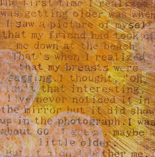 No. 2: "The first time I realized I was getting older was when I saw a picture of myself that a friend took of me down at the beach. That's when I realized that my breasts were sagging. I thought, "Oh, isn't that interesting," I never noticed it in the mirror but it did show up in the photograph. I was about 60, I guess, maybe a little older. But it didn't bother me."