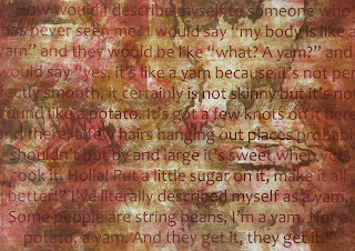 No. 6: "How would I describe myself to someone who has never seen me? I would say, 'My body is like a yam,' and they would be like, 'What? A yam?' and I would say, 'Yes, a yam because its not perfectly smooth, its certainly not skinny but its not round like a potato. Its got a few knots here and there, a few hairs hanging out places they probably shouldn't but by and large it's sweet when you cook it. Holla! Put a little sugar on it, make it all better!' I've literally described myself as a yam. Some people are string beans, I'm a yam. Not a potato, a yam. And they get it, they get it."